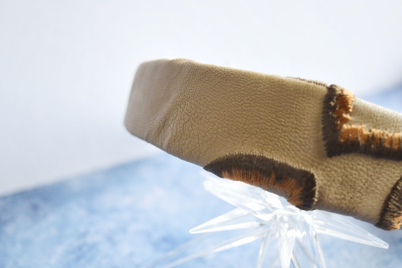 ・明るいキャメルベースにブラウンの刺繍がほどこされたクラシカルなデザイン。