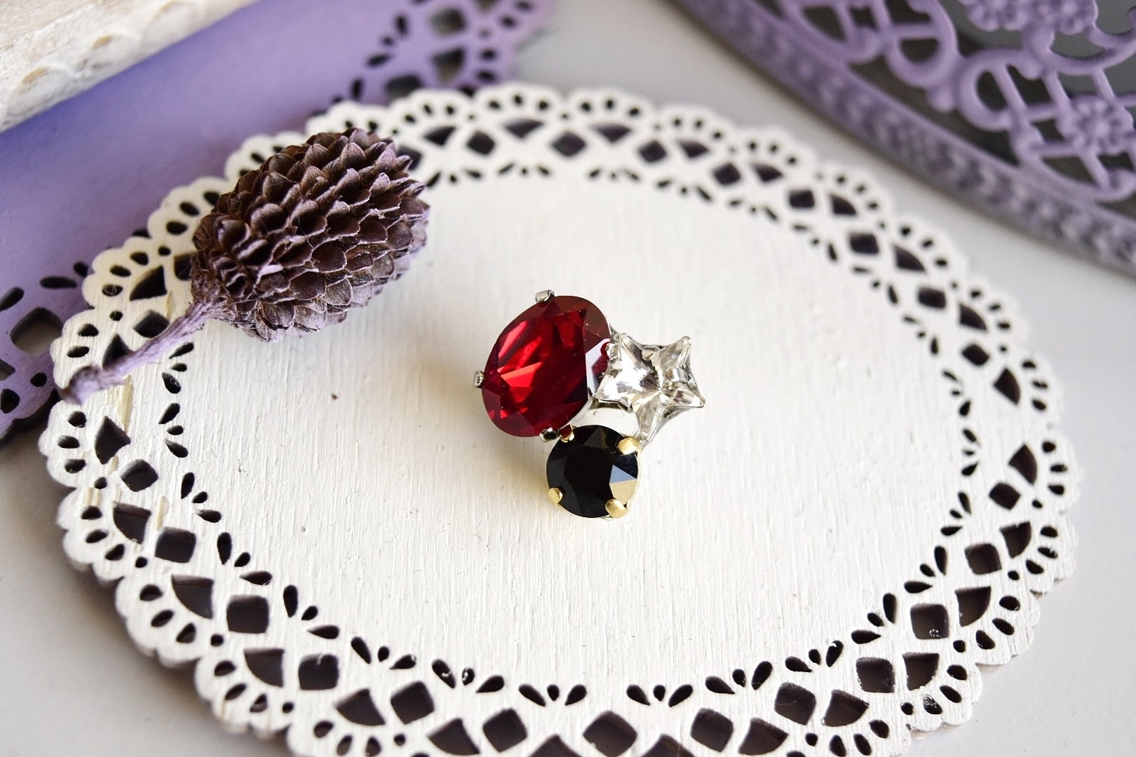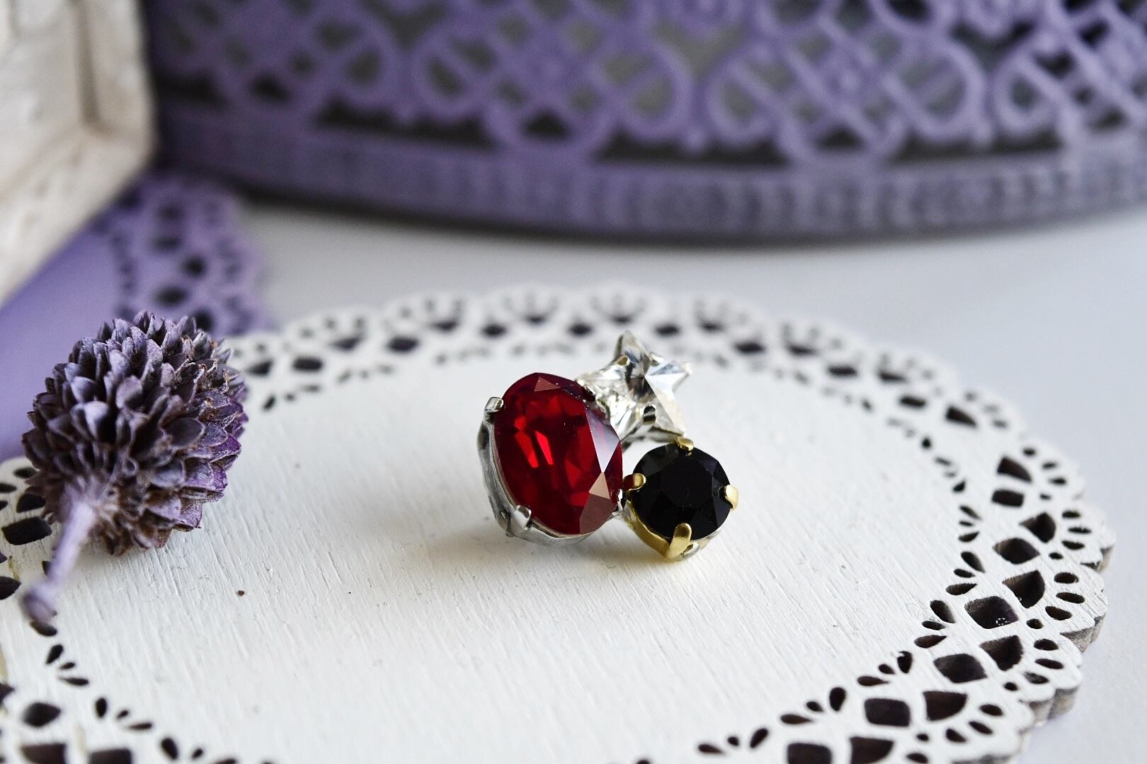・スワロフスキー社製クリスタルのビジューを使用した、星モチーフの小さなブローチ。レッドとブラックでインパクトのあるカラーリングがオシャレに使えます。金具もシルバーカラーとゴールドカラーのコンビなので、他のアクセサリーとも合わせやすいです。