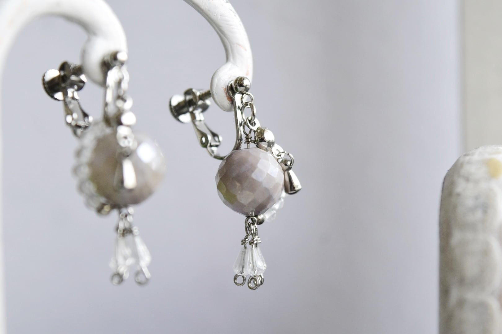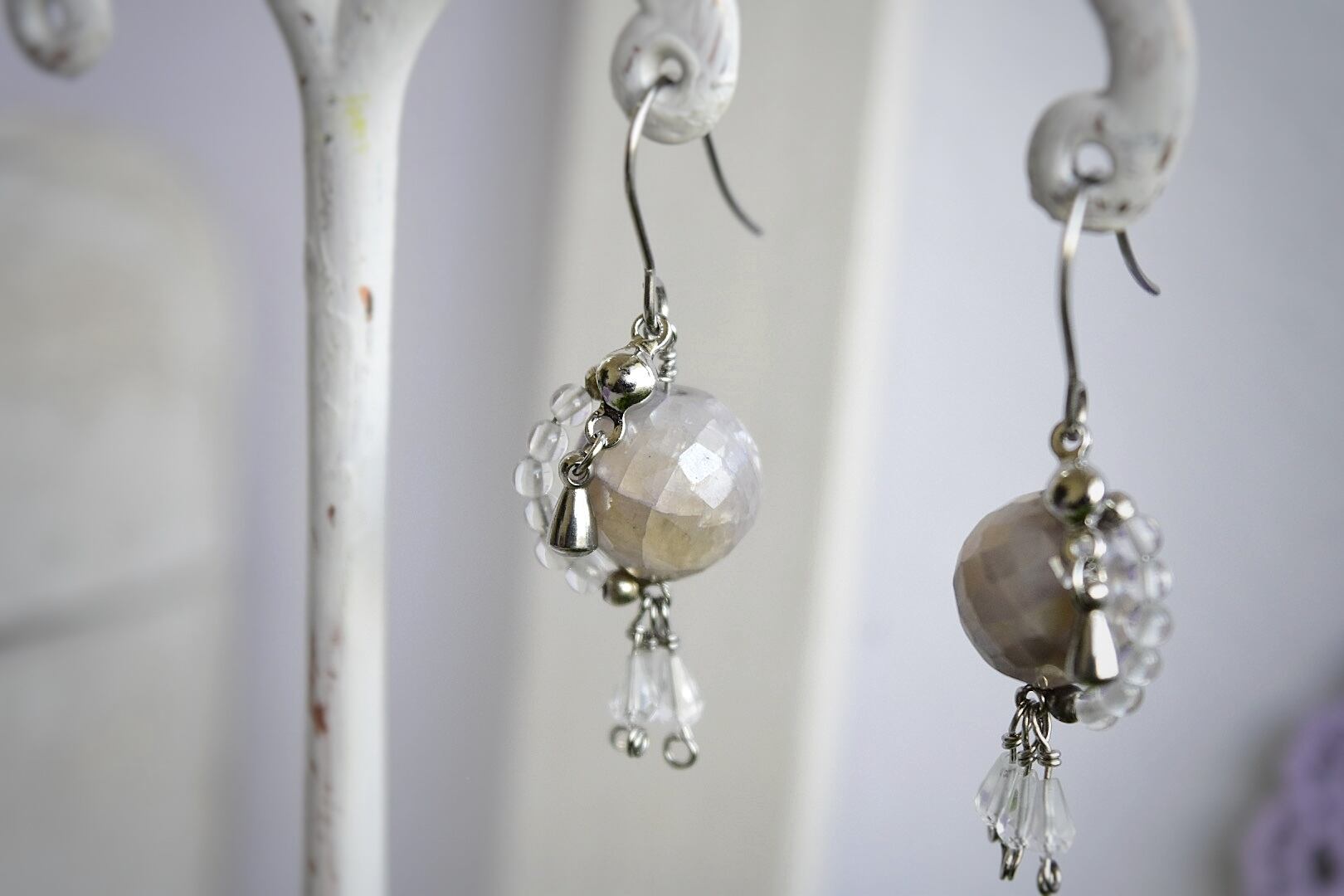 ステンレスピアスorステンレスイヤリング|月食モチーフ/グレームーンストーン×水晶/大きめ|【夜のぬくもり】シルバーカラー(10周年記念)