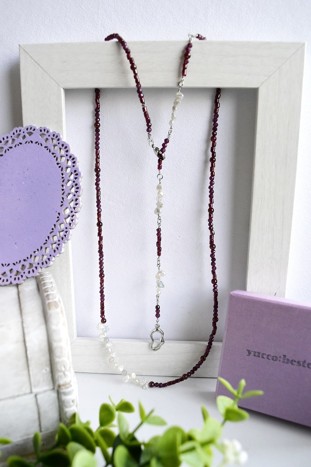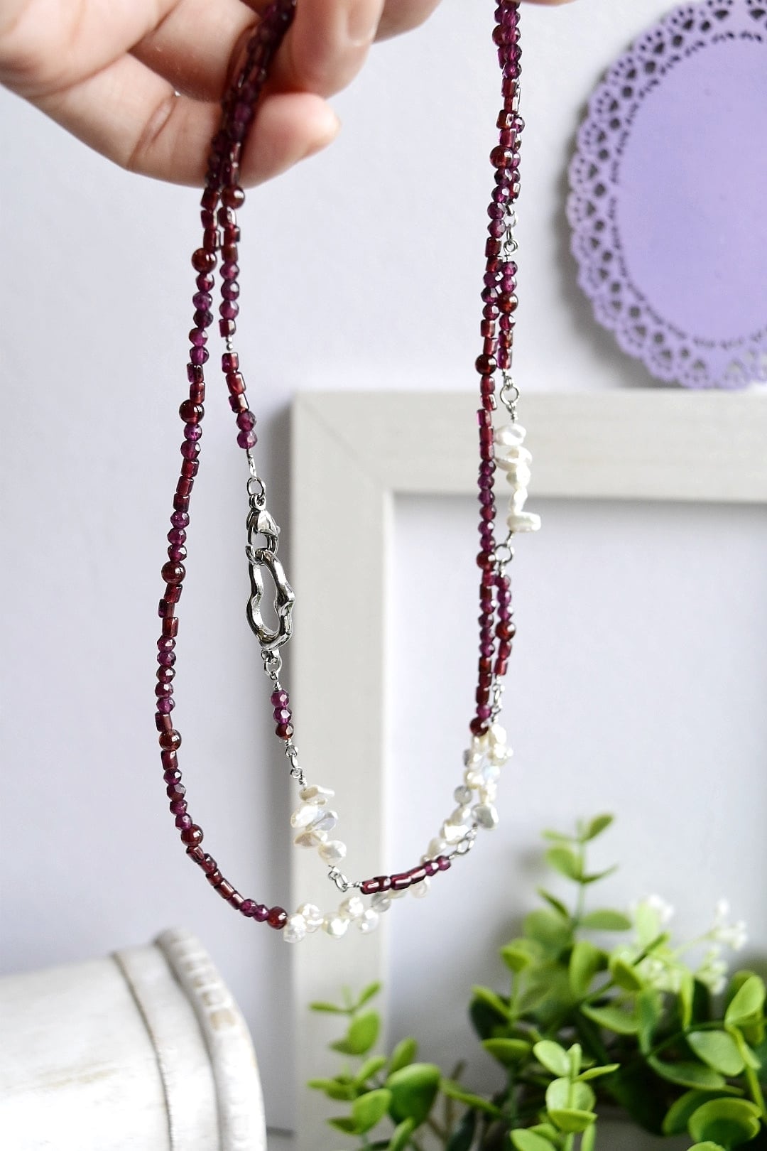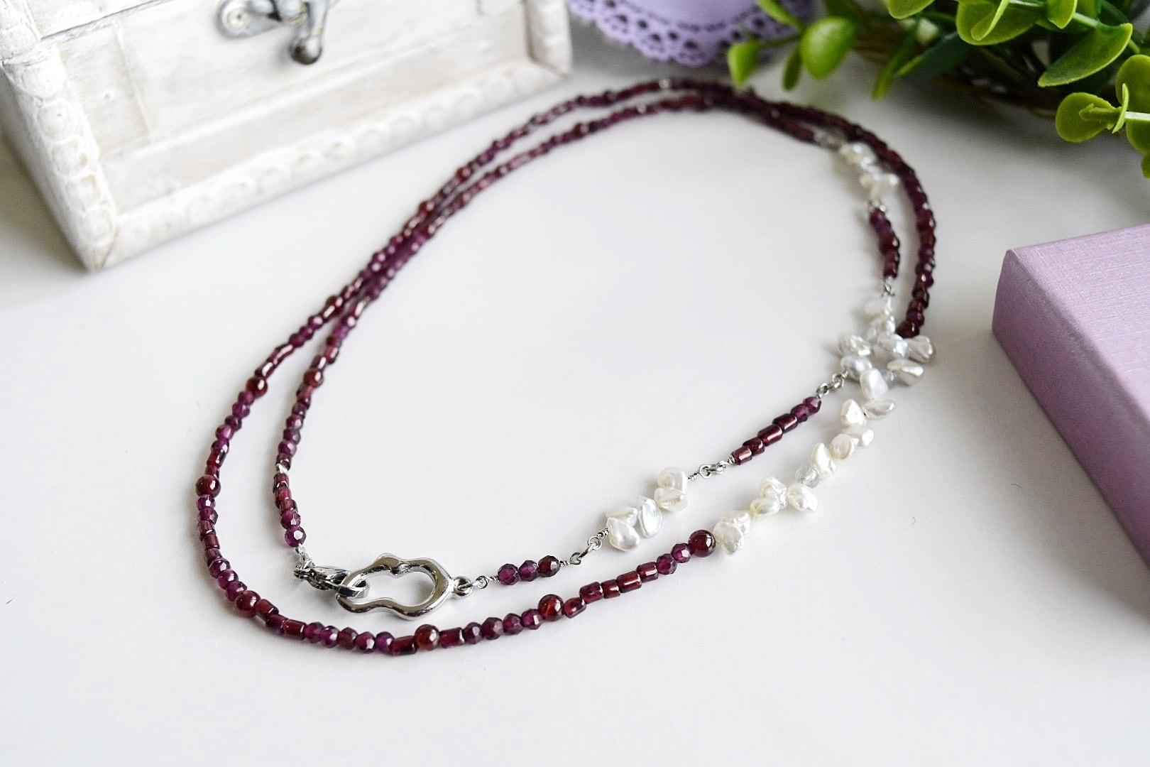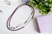 ロングネックレスアレルギー対応|ガーネット×淡水パール/80cm|【形にならない道】シルバーカラー(10周年記念)