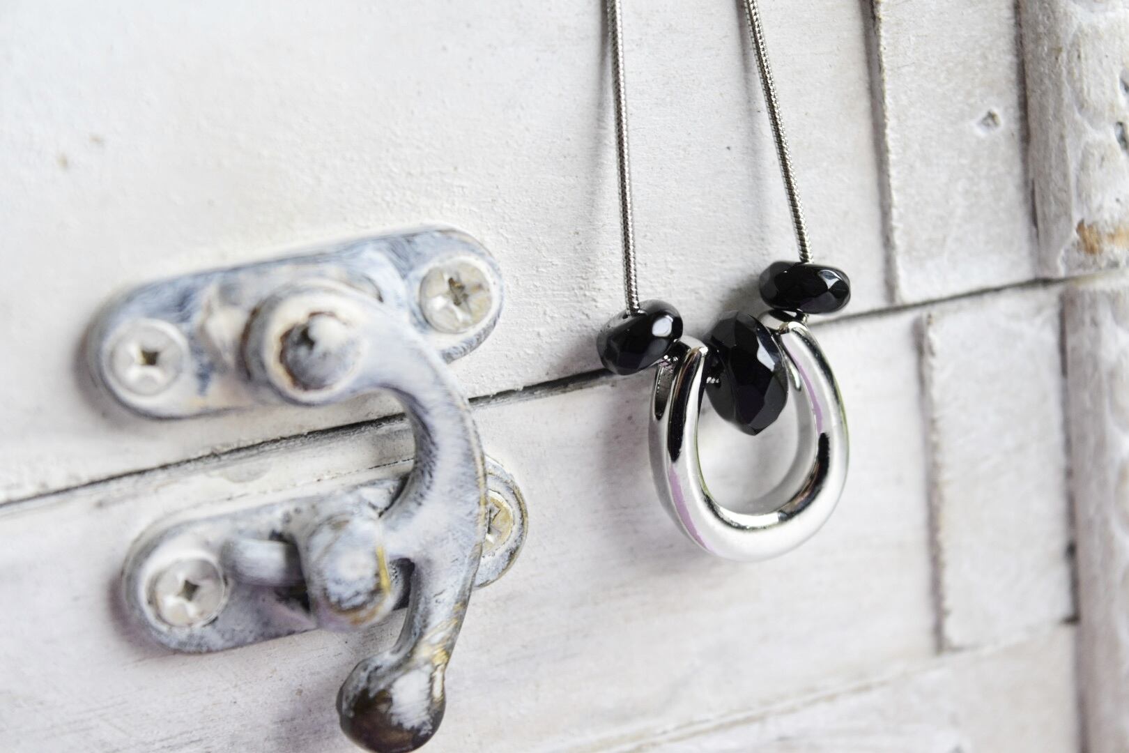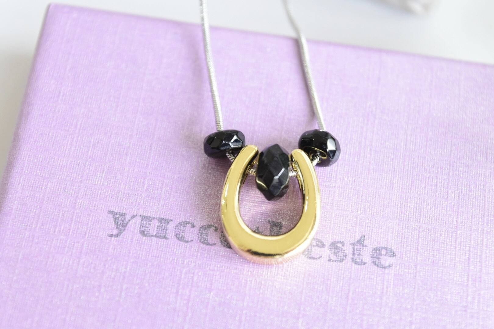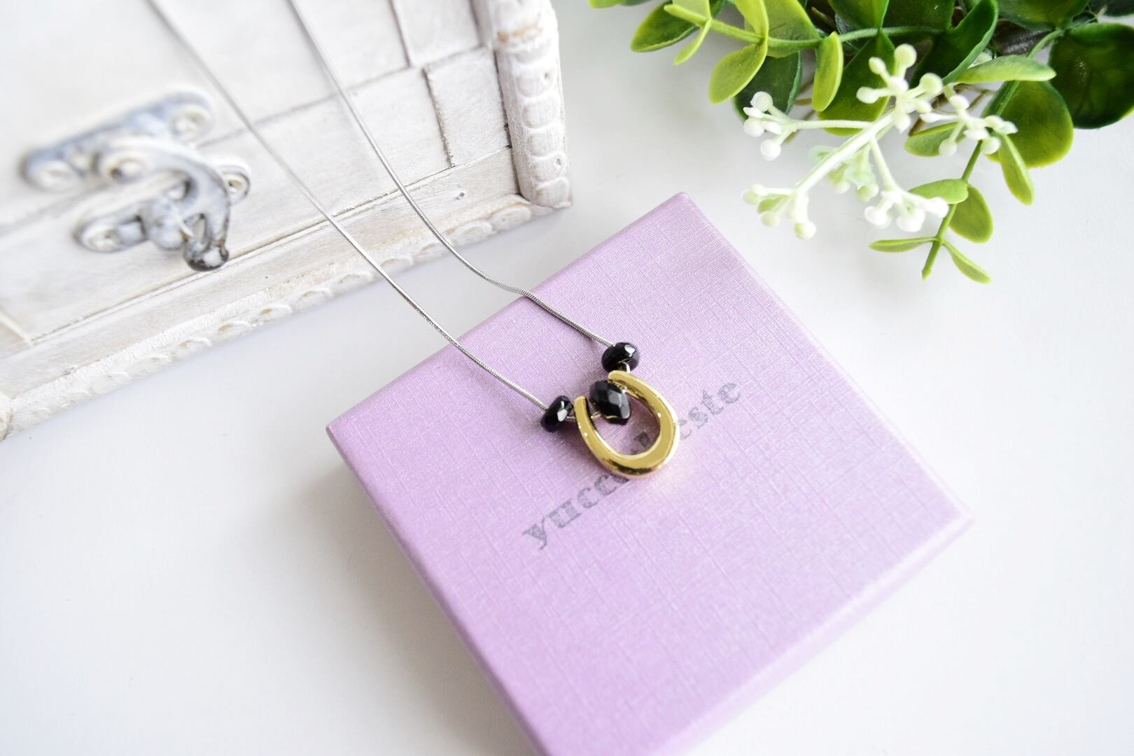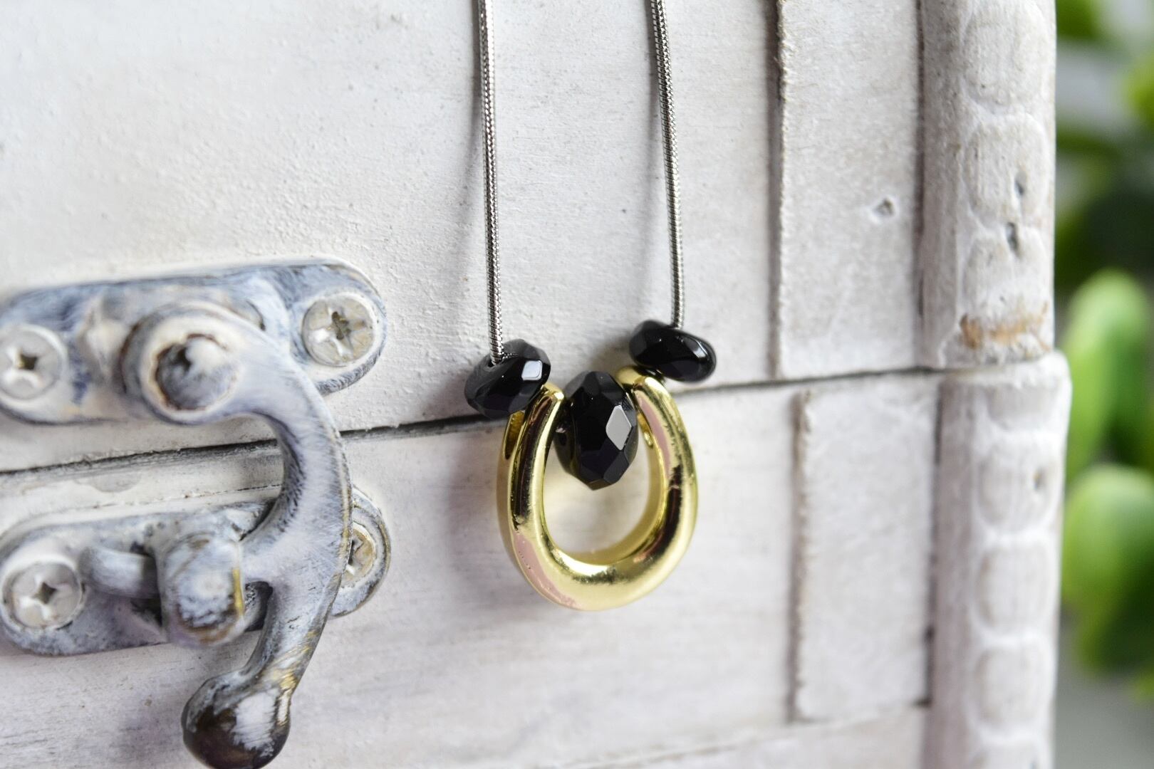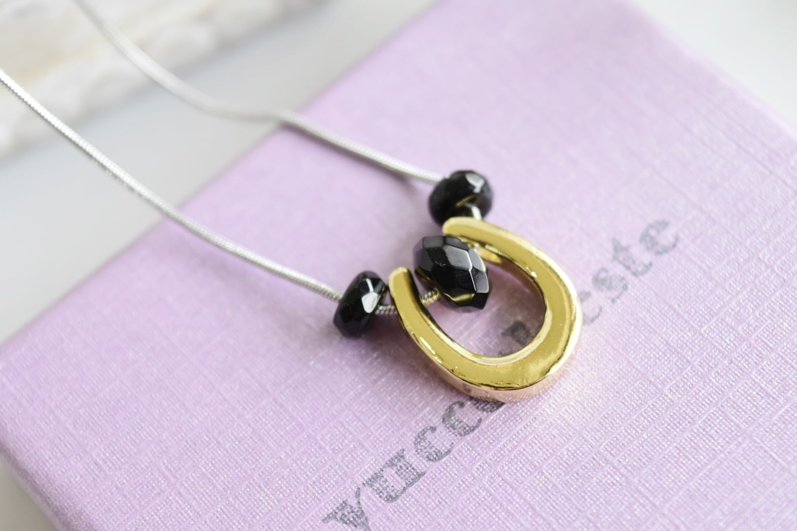 馬蹄モチーフとオニキスを取り入れたこのネックレスは、シルバーカラーまたはゴールドカラーの選択肢からお好みに合わせて選べます。スタイリッシュなデザインながら、持つ人に幸運を運んでくれるアイテムです。