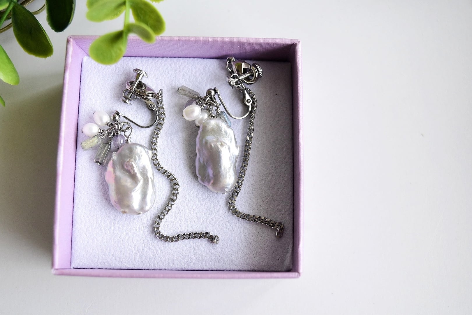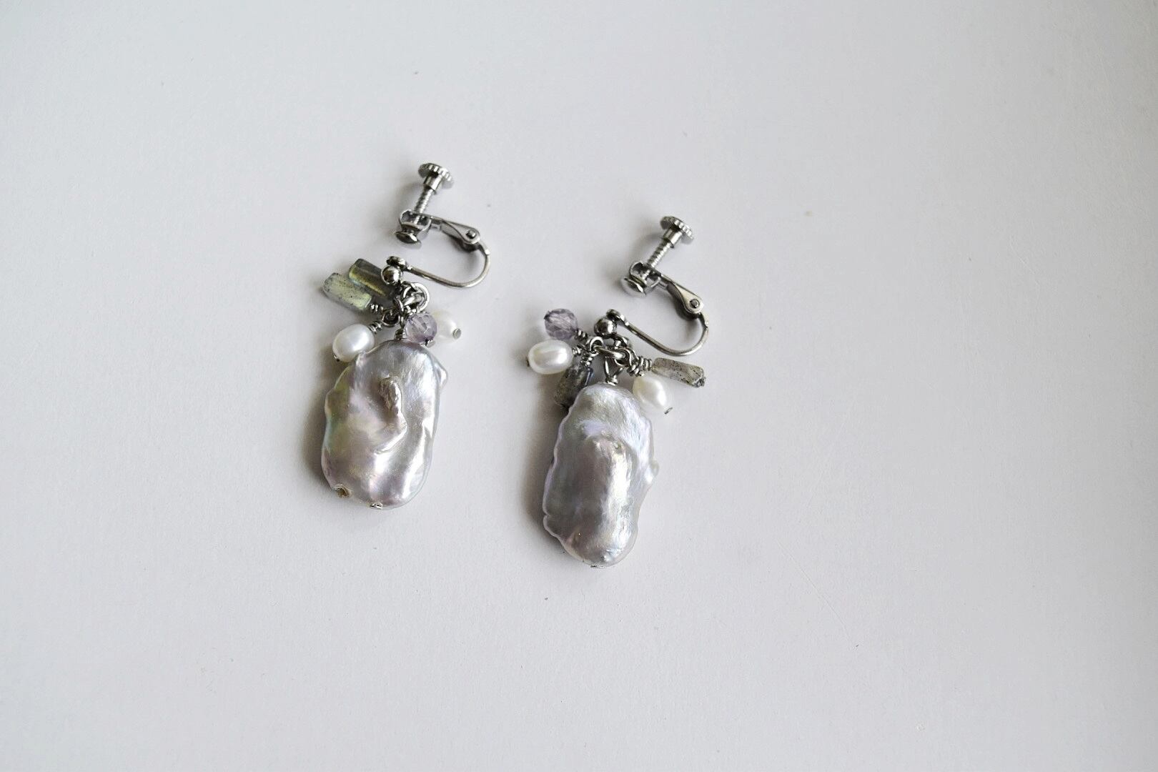 ①2wayステンレスイヤリング|/グレー淡水パール×ラブラドライト×ホワイト淡水パール×水晶/大きめ|【私に還る】シルバーカラー(10周年記念)