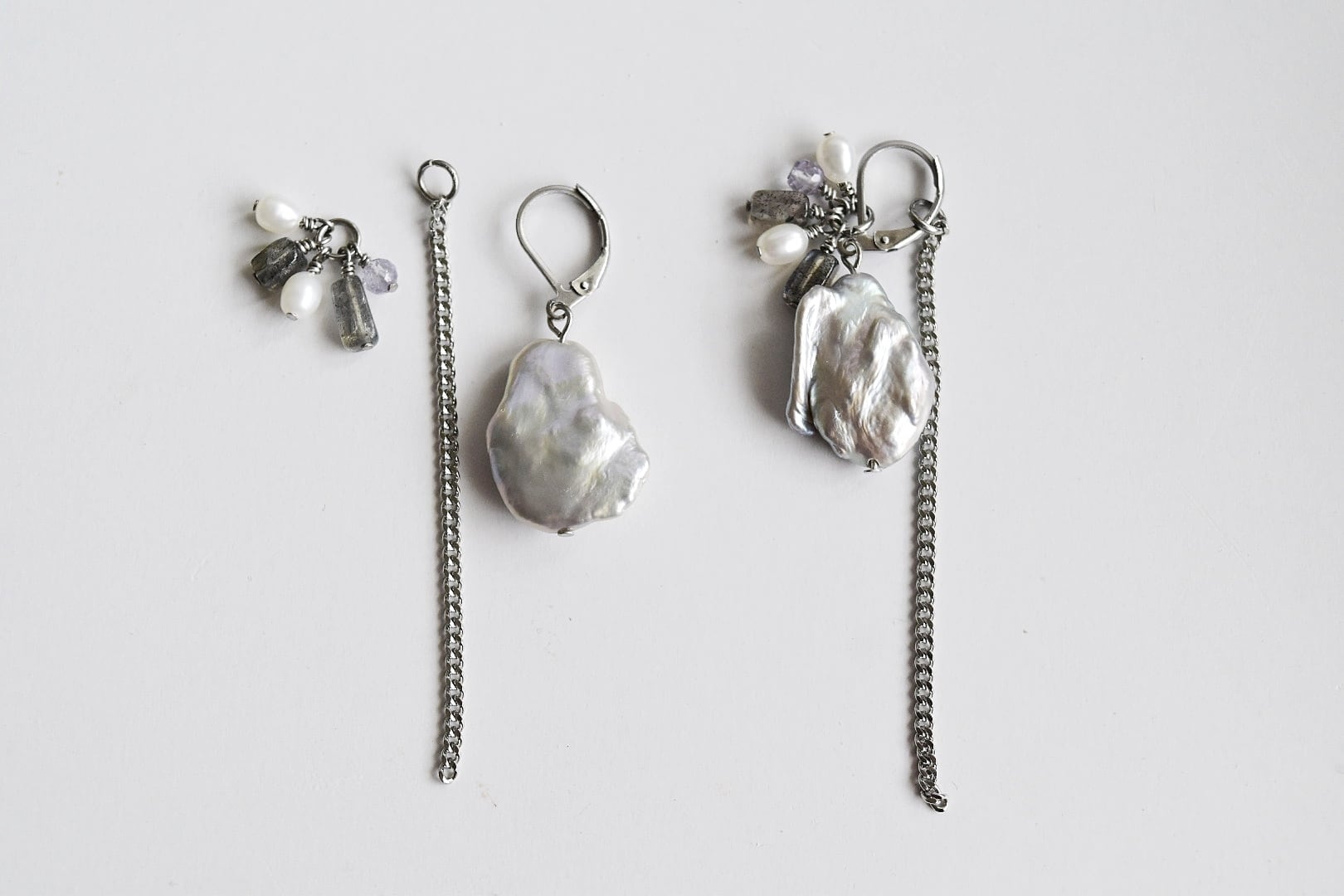 ③3wayステンレスピアス|/グレー淡水パール×ラブラドライト×ホワイト淡水パール×水晶/大きめ|【私に還る】シルバーカラー(10周年記念)