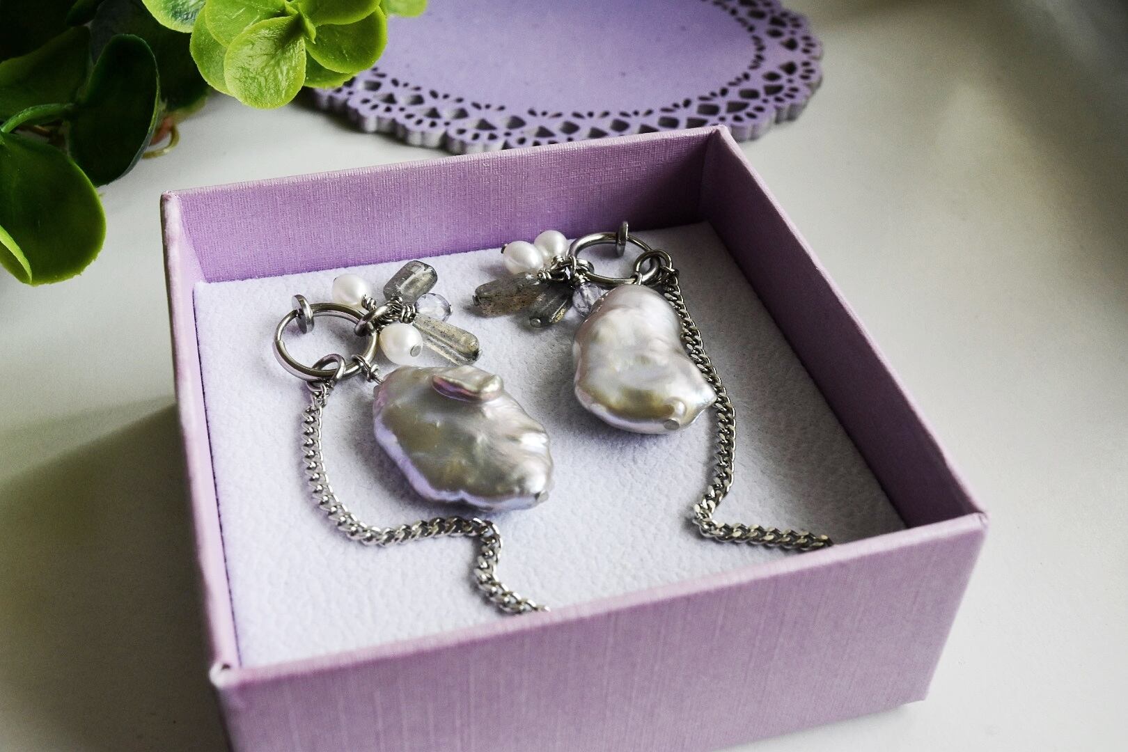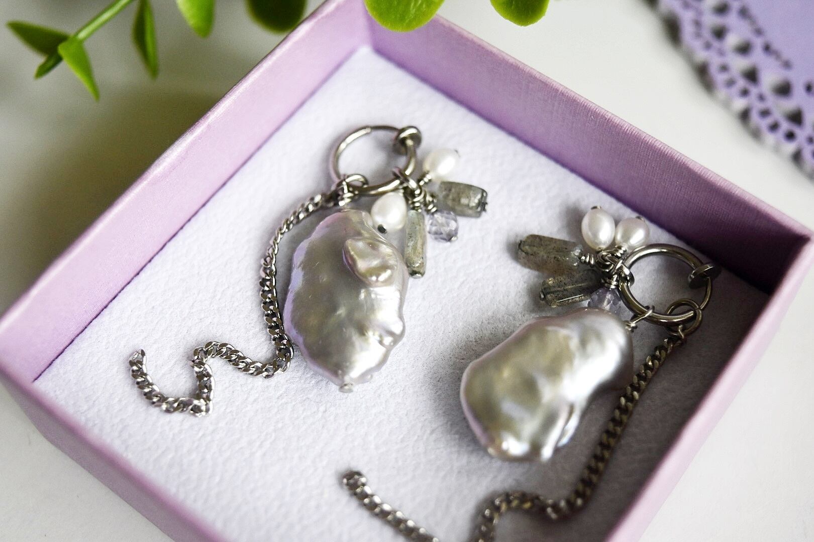 ②6wayステンレスイヤリング|/グレー淡水パール×ラブラドライト×ホワイト淡水パール×水晶/大きめ|【私に還る】シルバーカラー(10周年記念)